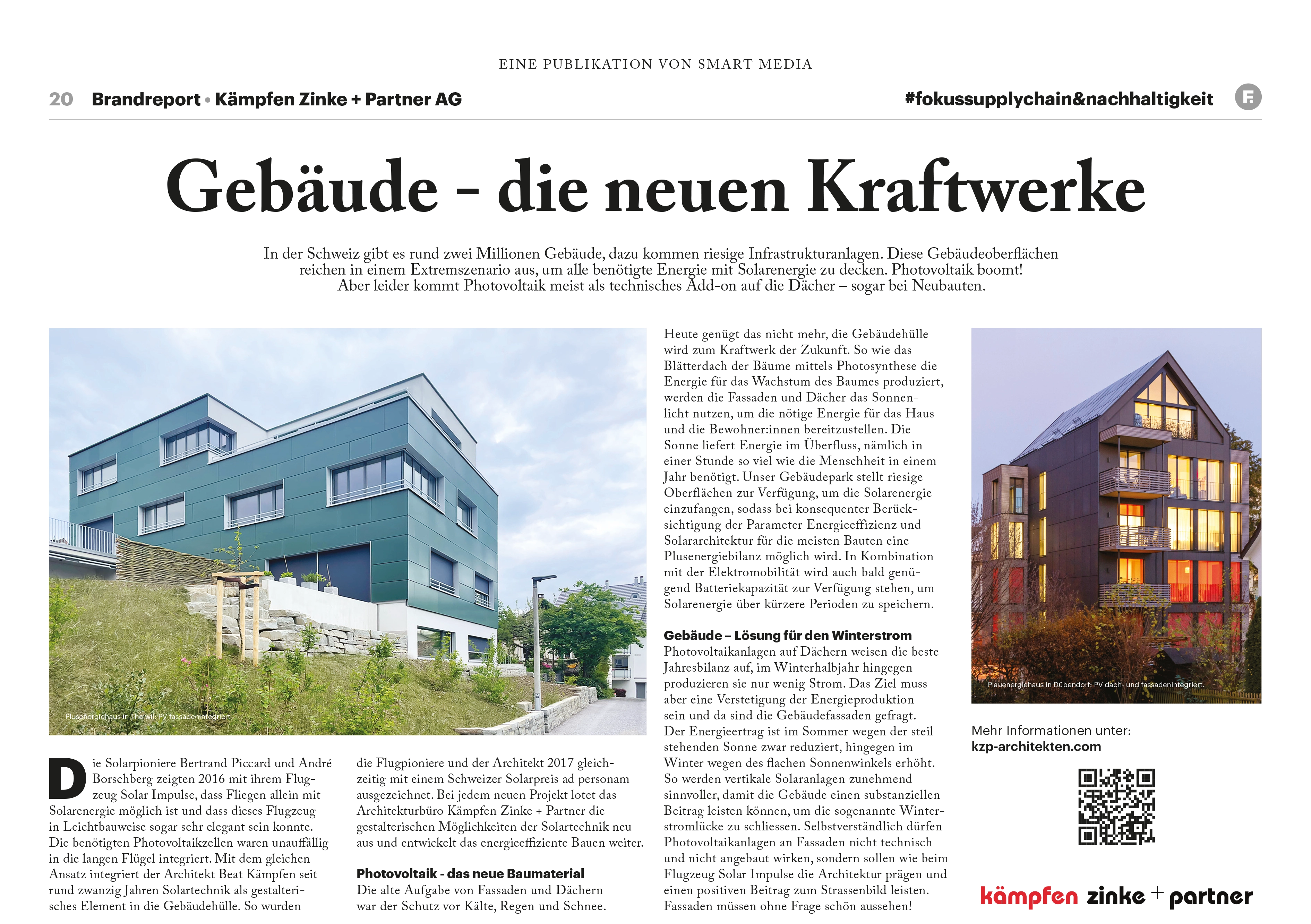 In der aktuellen Tages-Anzeiger von heute zu "Supply Chaines & Nachhaltigkeit" (S. 20) werden zwei unserer Projekte Thalwil und Dübendorf als Parade-Beispiele für Photovoltaik-Fassaden und Dächer vorgestellt.