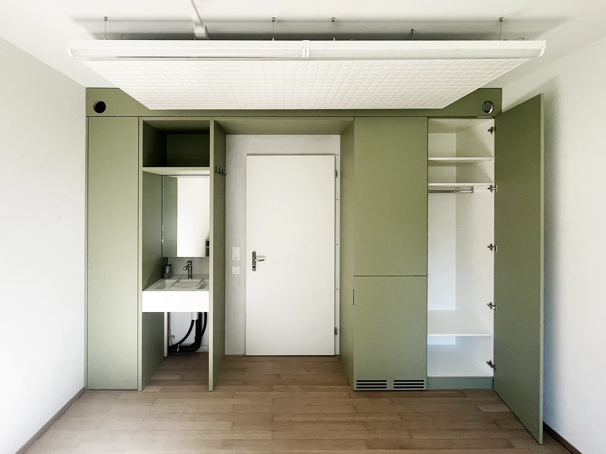 An der Wand zur Korridorseite befindet sich der Einbauschrank: Er vereint Stauraum, Lavabo, Kühlschrank mit Gefrierfach – und trägt zugleich die gesamte Haustechnik. Über ihn verlaufen Lüftung, Elektro- und Sanitärinstallationen sowie die Fortluftführung. Direkt darüber ist der Prototyp einer Warmwasser-Deckenstrahlplatte installiert, die künftig für Heizung und Kühlung sorgt. Damit wird der Schrank zum multifunktionalen Element, das Möbel und Technik in einem einzigen Bauteil verbindet.