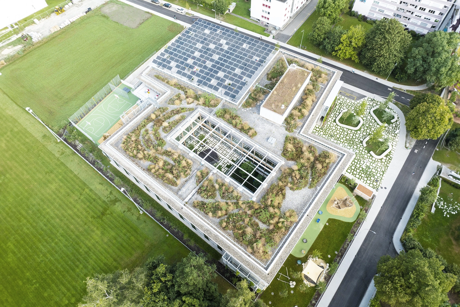 2023 erhielt die ISR das Zertifikat der Stiftung Natur & Wirtschaft für ihr umweltfreundliches Campusdesign – ein Beweis für den Wert von grünen Flächen nicht nur auf den Dächern, sondern auf dem gesamten Campus und im Innenhof. Das grosszügige Gründach mit bis zu 45 cm Substrat bietet wertvollen Lebensraum für Flora und Fauna, verbessert das Mikroklima und schafft eine lebendige Lernumgebung.