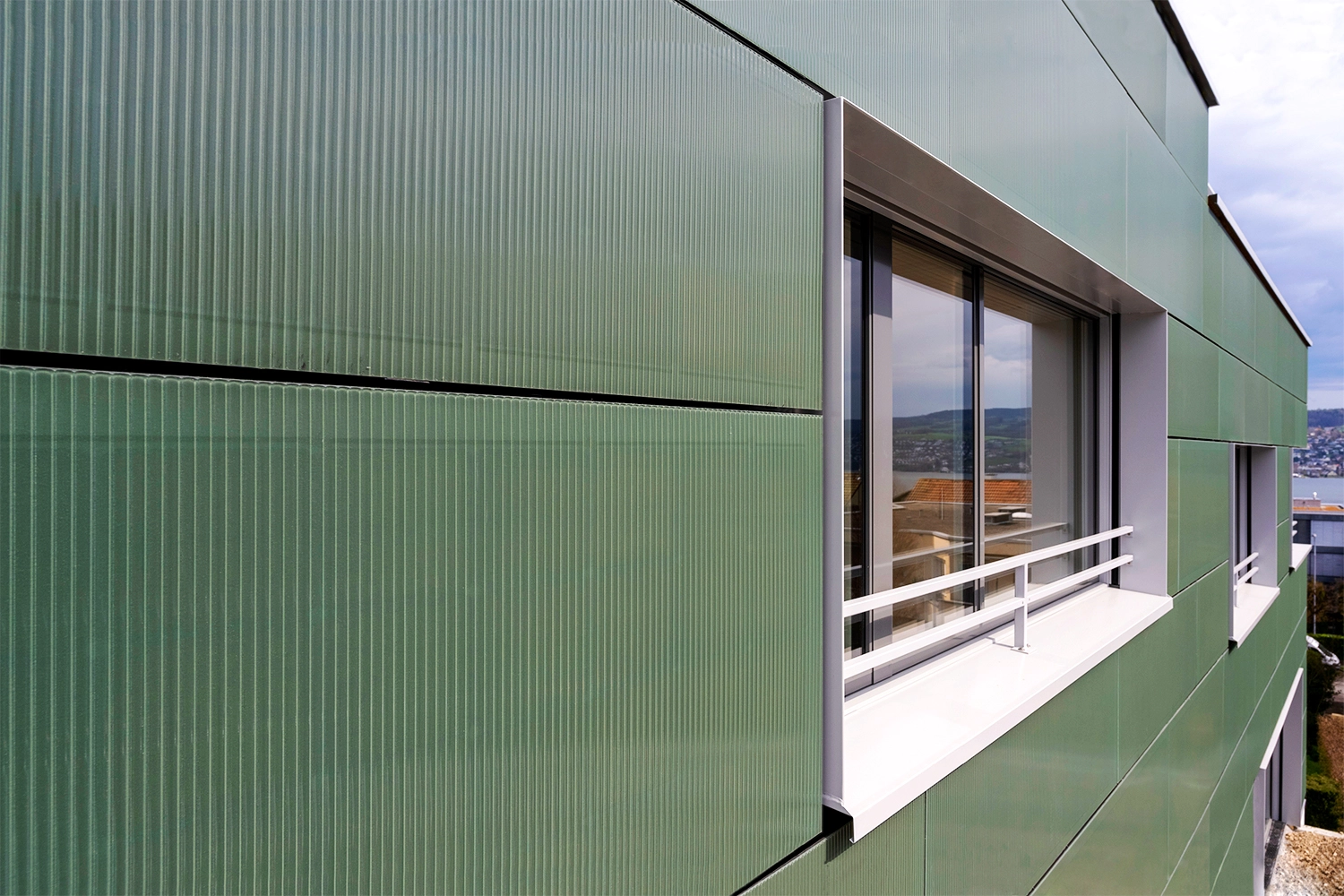 Die Fassade besteht aus geriffeltem Weissglas mit dunkelgrünem Siebdruck: eine robuste, ruhige Anmutung mit präzisen Öffnungsdetails und hoher Winterertragsfähigkeit. Auf dem Flachdach ergänzt ein dachparalleles PV-Feld den Ertrag. So entsteht eine klare, integrale Architektur, in der Gestaltung und Technik selbstverständlich zusammengehören.