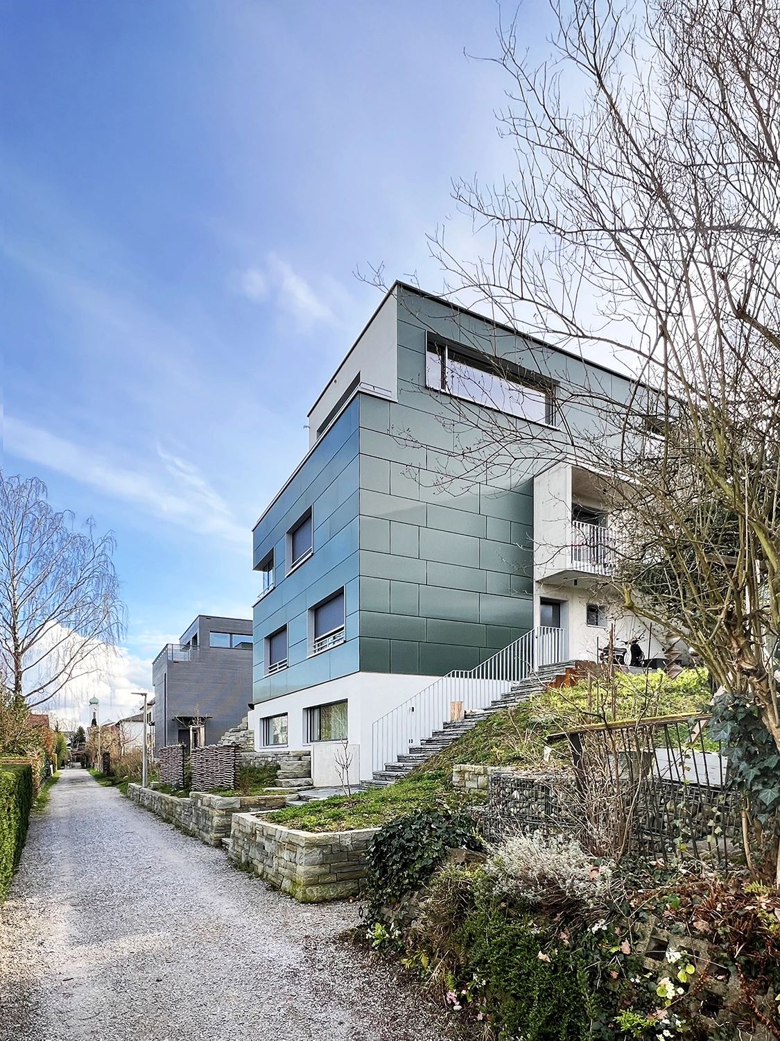 An aussichtsreicher Hanglage in Thalwil verbindet das Mehrfamilienhaus gebäudeintegrierte Photovoltaik (BIPV), einen effizienten Holzbau und ein smartes Energiesystem. Gemeinsam mit zwei Liegenschaftern bildet es einen ZEV und produziert im Jahresmittel mehr Energie, als im Betrieb benötigt wird.